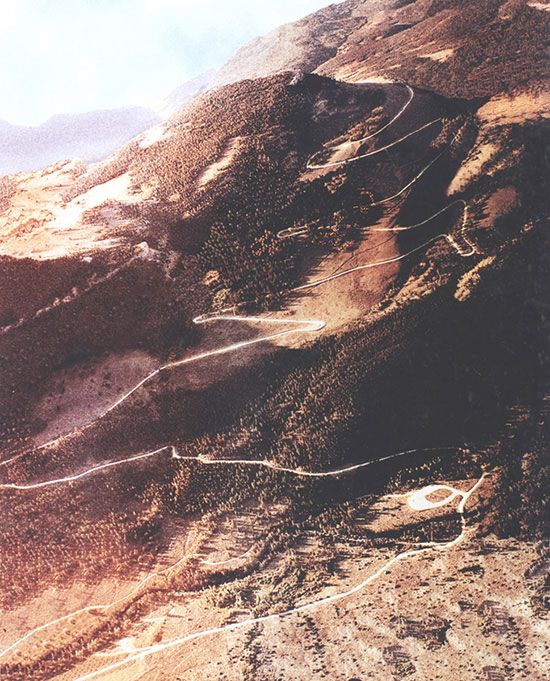 This photo by George Mattocks was taken from an airplane and shows the switchbacks before the road was paved.