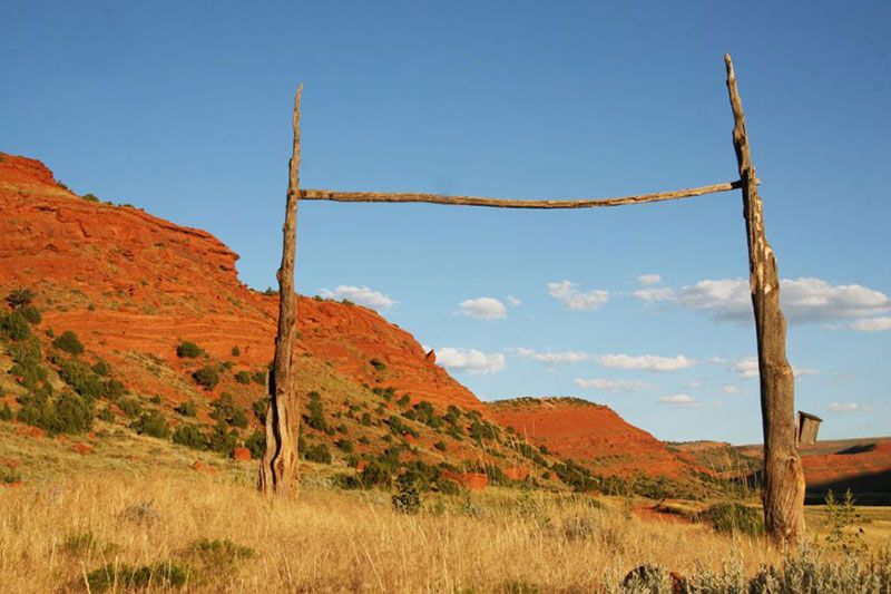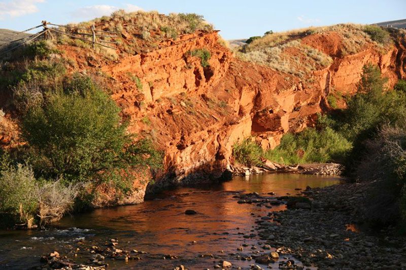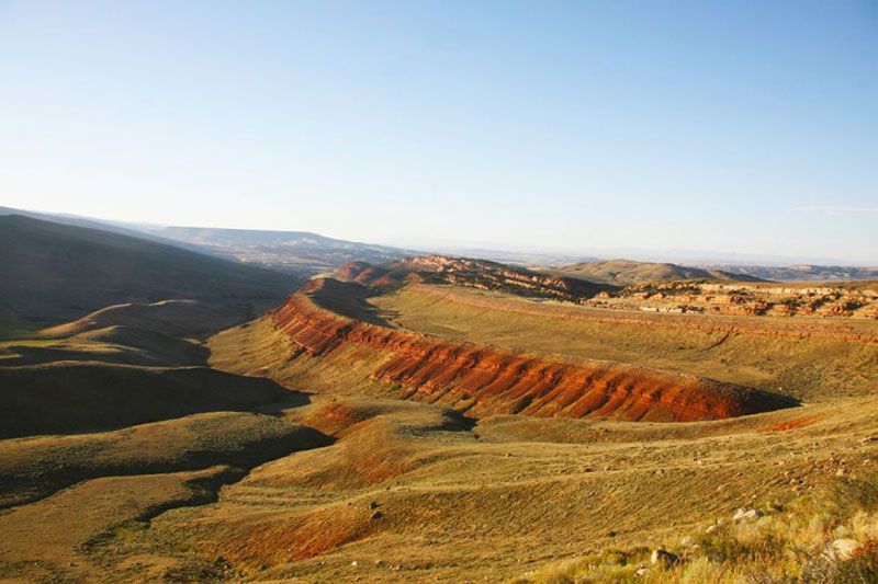 As you head for Lander you come to the rim of Red Canyon, a large exposure of Chugwater Sandstone. The spectacular cliffs red color come from oxidized iron in the formation. The canyon is especially colorful in the evening as the late afternoon sun lights up the red rock.
