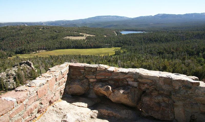 At twenty miles from Lander you come to Blue Ridge, at 9500’ the high point of the road. At the top there is a parking area and to the right a ½ mile trail leads to the old Blue Ridge fire lookout. The trail is steep, but leads to a large rock outcrop (elevation 9840’) with a spectacular view of the surrounding area including the Wind River Mountains, the Owl Creek Mountains, and much of the Wind River Basin A fire lookout was built on the outcrop by the Civilian Conservation Corp in 1938, but is gone now.