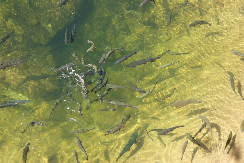 The highway enters Sinks Canyon crossing under tall sandstone cliffs at 5 miles. The Rise of the Sinks and the famous trout pool are one mile further up the road, with the Sinks cavern a quarter mile beyond that.