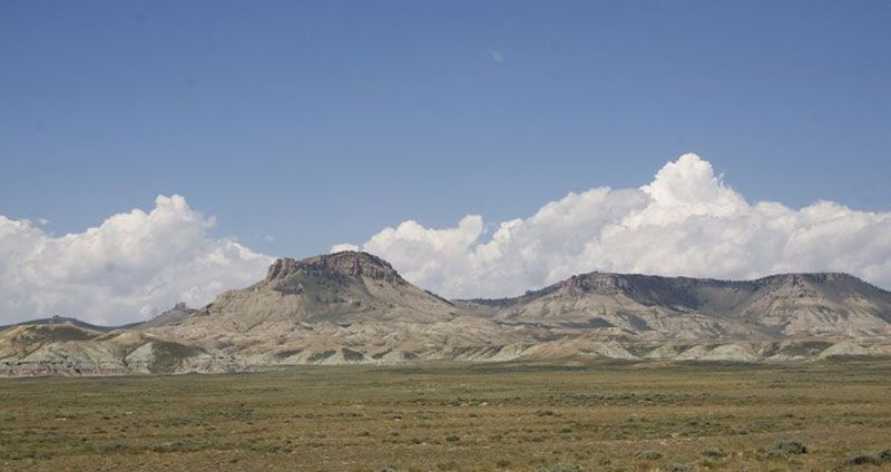 The trip starts by heading south on Highway 131 out of Lander. Four miles outside of Lander Table Mountain comes into view to the left. It is a long, flat-topped mesa. In front of the mountain are large outcrops of bright reddish orange rock called Chugwater Sandstone laid down during the Triassic Period over 200 million years ago.