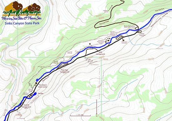 The North Slope Trail is the newest hiking trail in the canyon, and connects the Popo Agie Nature Trail to the Sinks to Rise Trail. Now hikers can hike from the Rise all the way to the Falls on beautiful trails if they wish. To access the trail on the lower end start at the Rise and follow the paved path called the Sinks to Rise Trail towards the Sinks. Across Highway 131 and about 100 yards down the trail a dirt trail cuts off towards the overflow channel (there is a sign for the North Slope trail here). Cross the overflow channel (a rocky dry streambed which cannot safely be crossed during spring runoff when it is full of water), then climb a series of steep switchbacks until you are in the heavy timber of the north facing slope. From here the trail follows the contours of the slope up canyon offering beautiful views down to the Lander Valley and up to the Wind River Mountains. The trail is rocky and steep in places. After a mile it drops into a meadow and joins the Popo Agie Nature Trail.