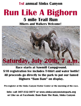 Sinks Canyon’s Bam Bam Slam is Saturday, July 20. Events will take place all day with the theme of Bighorn sheep. There will be a morning 5 mile trail run, kids activities, a bake sale and a memorial service for the famous Sinks Canyon Bighorn Bam Bam.