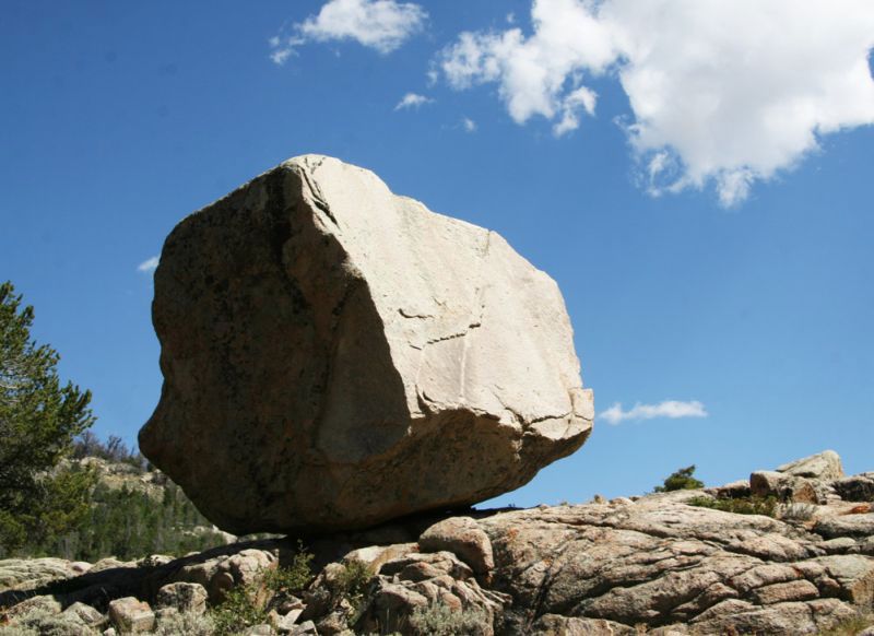 The most recent major geologic force that shaped Wyoming as we know it today were the Ice Ages. For the past 3 million years the earth’s climate has periodically cooled and gotten wetter allowing huge sheets of ice to form in the mountains. These sheets of ice became so thick they created glaciers, sheets of ice often miles thick, which then began to flow down towards the valleys. These massive walls of ice acted as huge bulldozers carving canyons, and shaping the jagged peaks and cirques of Wyoming’s mountain ranges. There were at least four major glaciations and several smaller ones. The most recent glacial event ended about 10,000 years ago and evidence of it is all around Sinks Canyon. Huge granite boulders carried from high in the mountains and deposited in the canyon are evidence of the power of the ice.