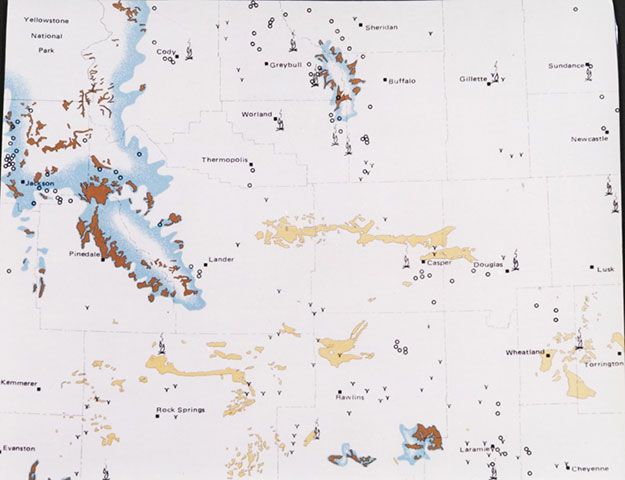 This maps shows the extent of the glacial ice at the height of the most recent ice age. The Wind River Mountains and most of the Northwest corner of the state were covered by thousands of feet of ice. The yellow represents sand dunes (many of which still exist today) created by the wind blowing fine sand from glacial outwashes.