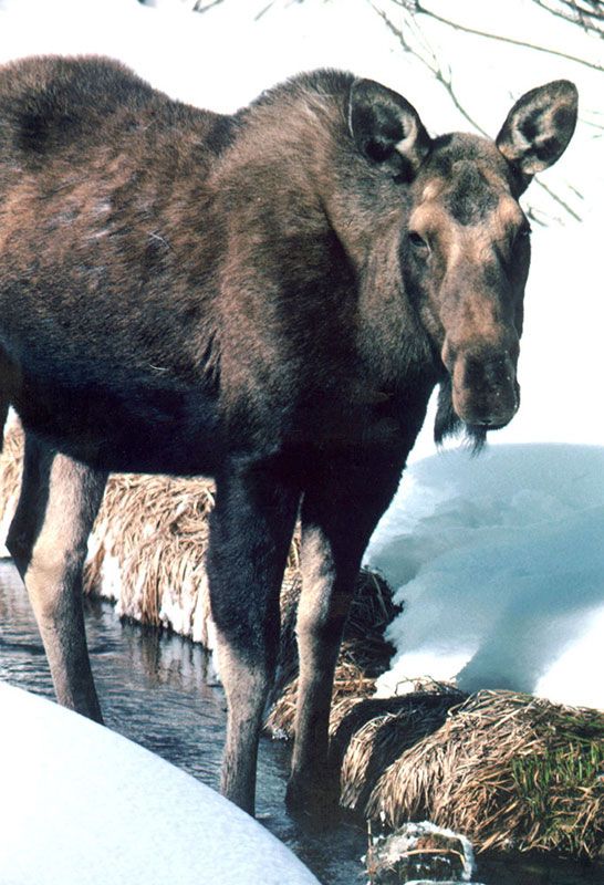 The moose is the largest member of the deer family. The Shiras Moose is the species found in the Rocky Mountains. Moose are seen along the Popo Agie, eating the abundant vegetation growing around the river. The moose may appear awkward, but it is well adapted to its environment. The long legs allow the moose to step over downed logs and cross streams. The legs are positioned so that when a step is taken each leg is raised straight up making it easier to move in deep water or snow. The conspicuous “bell” hanging from the throat of both males and females is a secondary sexual characteristic.