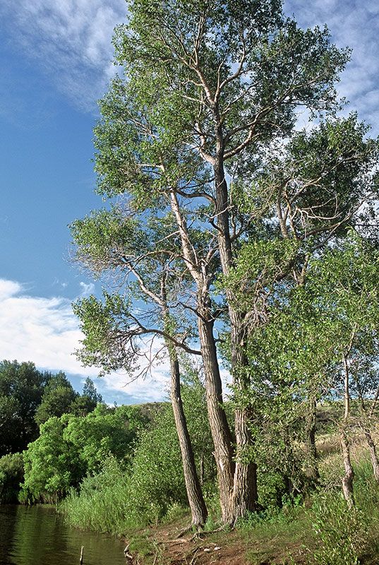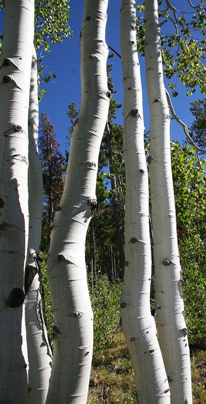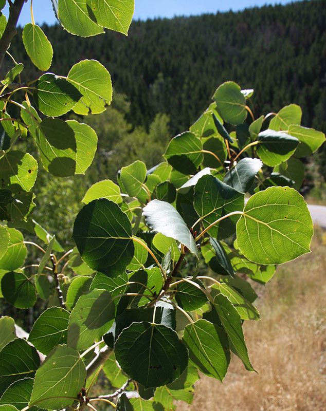 Aspens grow at elevations from 5,600 feet to timberline. They usually grow in riparian areas or places that have heavy snow in the winter. The trees are called quaking aspens because the heart-shaped leaf flutters in the slightest breeze. The leaves are dark green above and light green below which makes them appear to shimmer in the wind. Aspens are one of the first trees to re-colonize an area after a fire or other disturbance. Aspens produce seeds, but most reproduce by sending up runners from their shallow root system. In an aspen grove there may be many trees, but they are probably all from the same root system, and therefore part of the same tree.