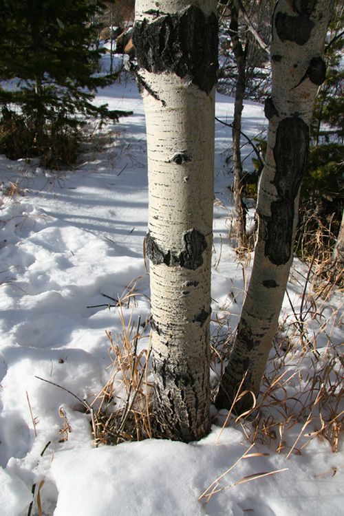 Aspens can live longer than 200 years. The rough dark areas on the trunks are scars from age and injuries. Broad-tailed Hummingbirds feed on the abundant flowers around aspen groves, and the red-napped sapsucker feeds on sap from holes it bores in the trees. Many other birds nest in the crowns. Two large rodents that are fond of aspen are porcupine and beaver. Both eat aspen bark and beaver use the trees to build their lodges and dams.