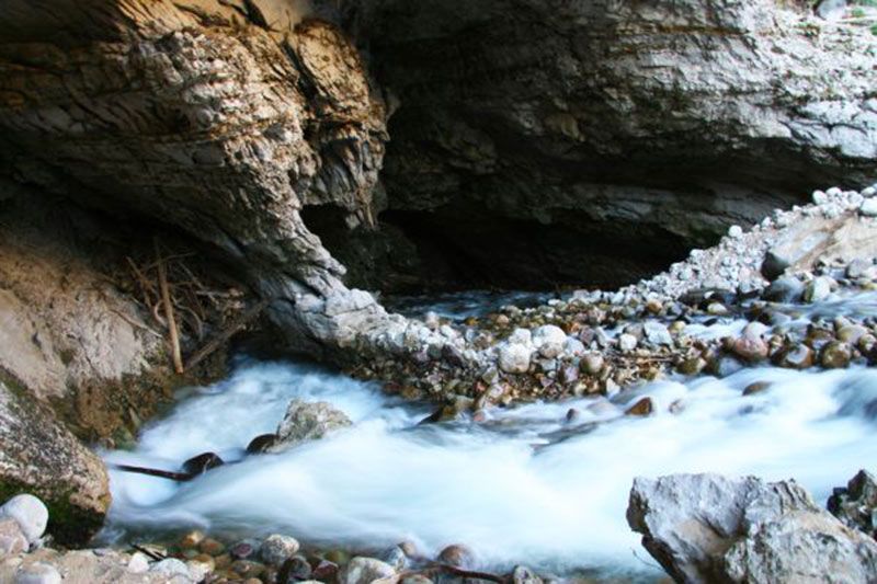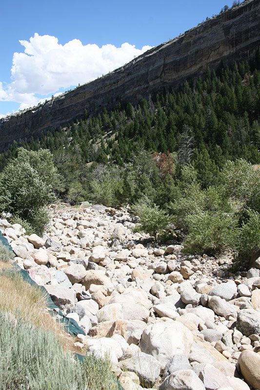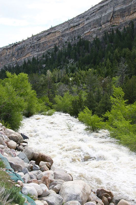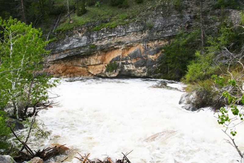 The “Sinks” of Sinks Canyon is a large cavern where the rushing river flows into cracks and crevices in the cavern floor and disappears underground. The river reappears down canyon in a large pool called “The Rise.”