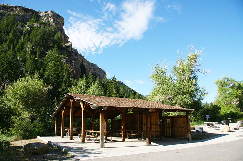 There is a large day use picnic shelter at Sawmill Campground that is available on a first come first served basis. The shelter can be reserved for a $35 fee and $35 deposit. Call 307-332-3077 to make reservations.